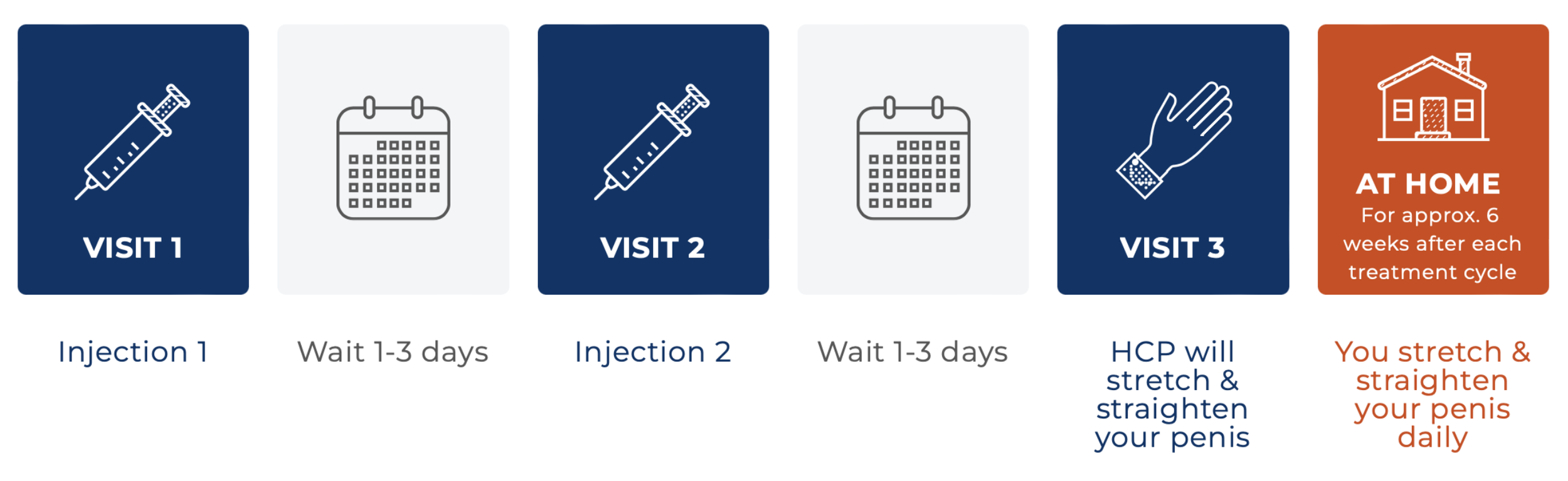If you have a bump, or “plaque”, you can feel and bend 30 degrees or greater Xiaflex might be the right treatment for you. Xiaflex is an FDA approved injectable treatment for men with P.D. The injections help to break down scar tissue over time. There are two parts to treatment: The first is the in office injections. The second is performing daily gentle outpatient penile stretching and straightening activities.